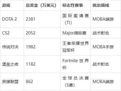 DOTA 2以2381万美元蝉联2024年赛事奖金榜首,其国际邀请赛(TI)单届奖金峰值曾达4000万美元,堪称“电竞世界杯”的终极殿堂;